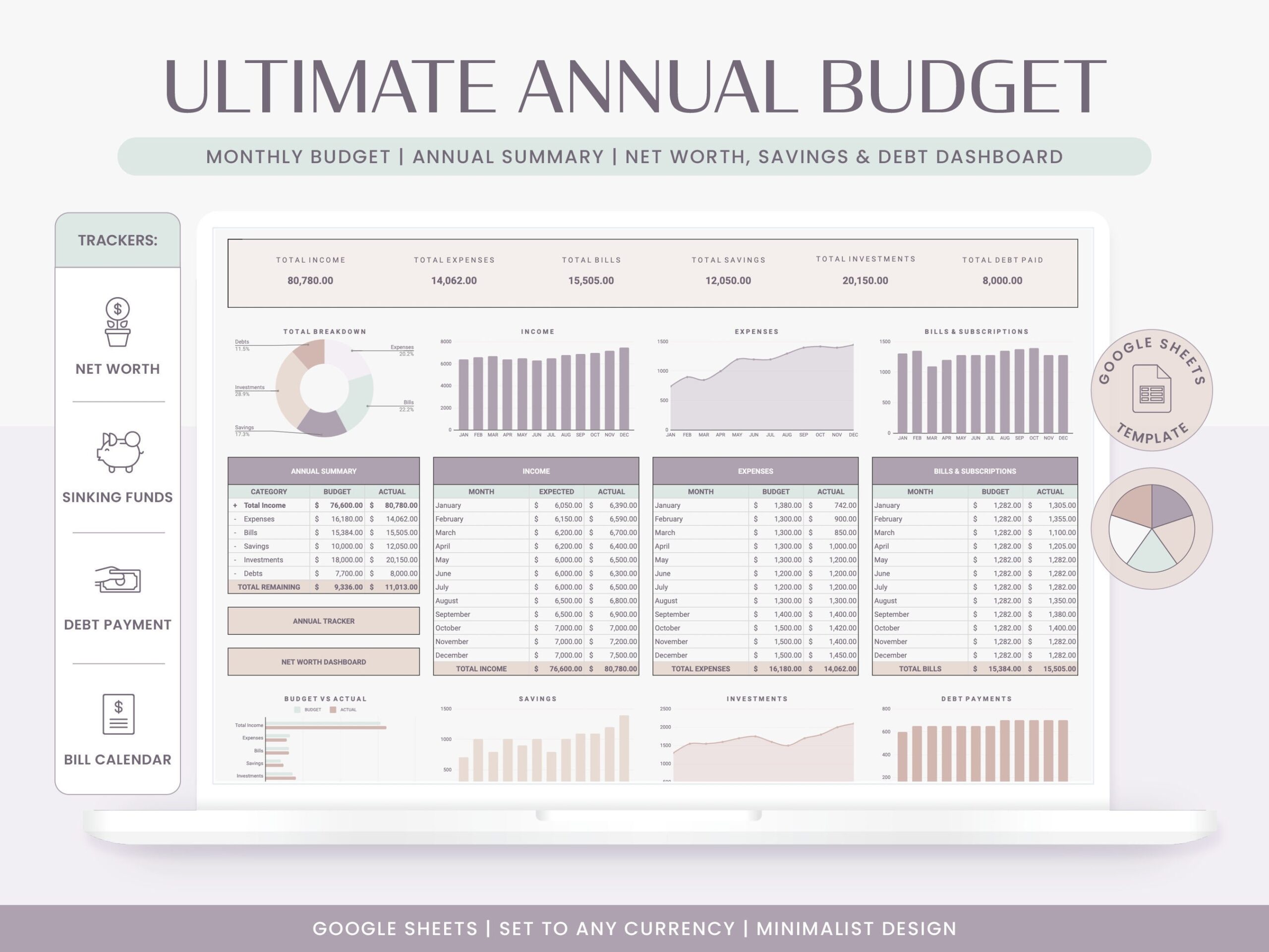 Annual Budget Spreadsheet Google Sheets Budget Template Monthly Budget Planner Finance Planner Net Worth Yearly Budget Paycheck Etsy