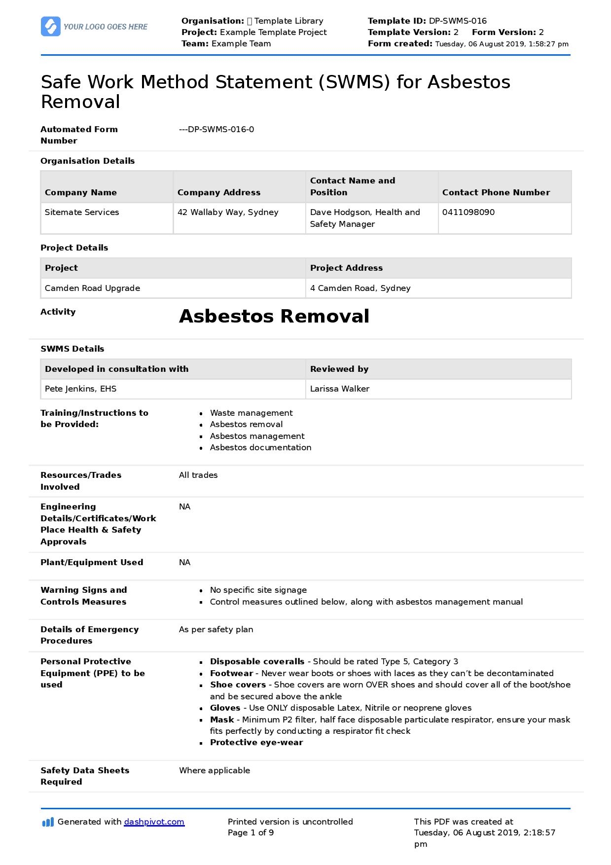 Asbestos Safe Work Method Statement For Asbestos Removal Etc