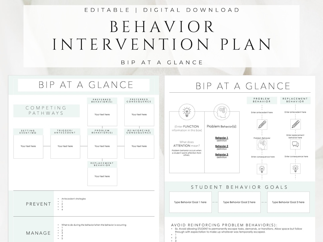Behavior Intervention Plan BIP At A Glance Digital Download Editable ABA Therapy School Psychologist FBA Template Behavioral Etsy