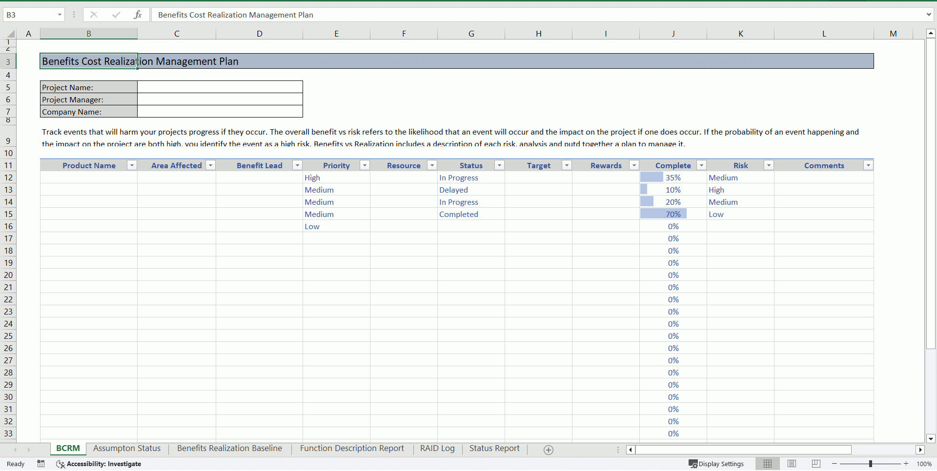 Benefits Cost Realization Management Plan Template Excel