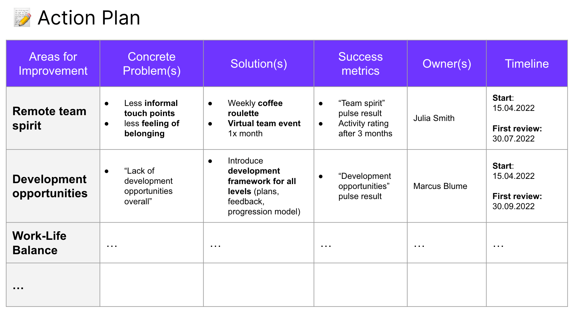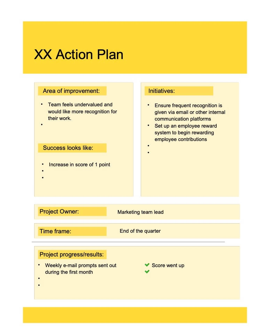 Regularly review and adjust the action plan as needed. Monitor the impact of the changes implemented and make necessary revisions to continue improving engagement levels. By staying proactive and responsive, you can create a positive work environment that fosters growth and success.