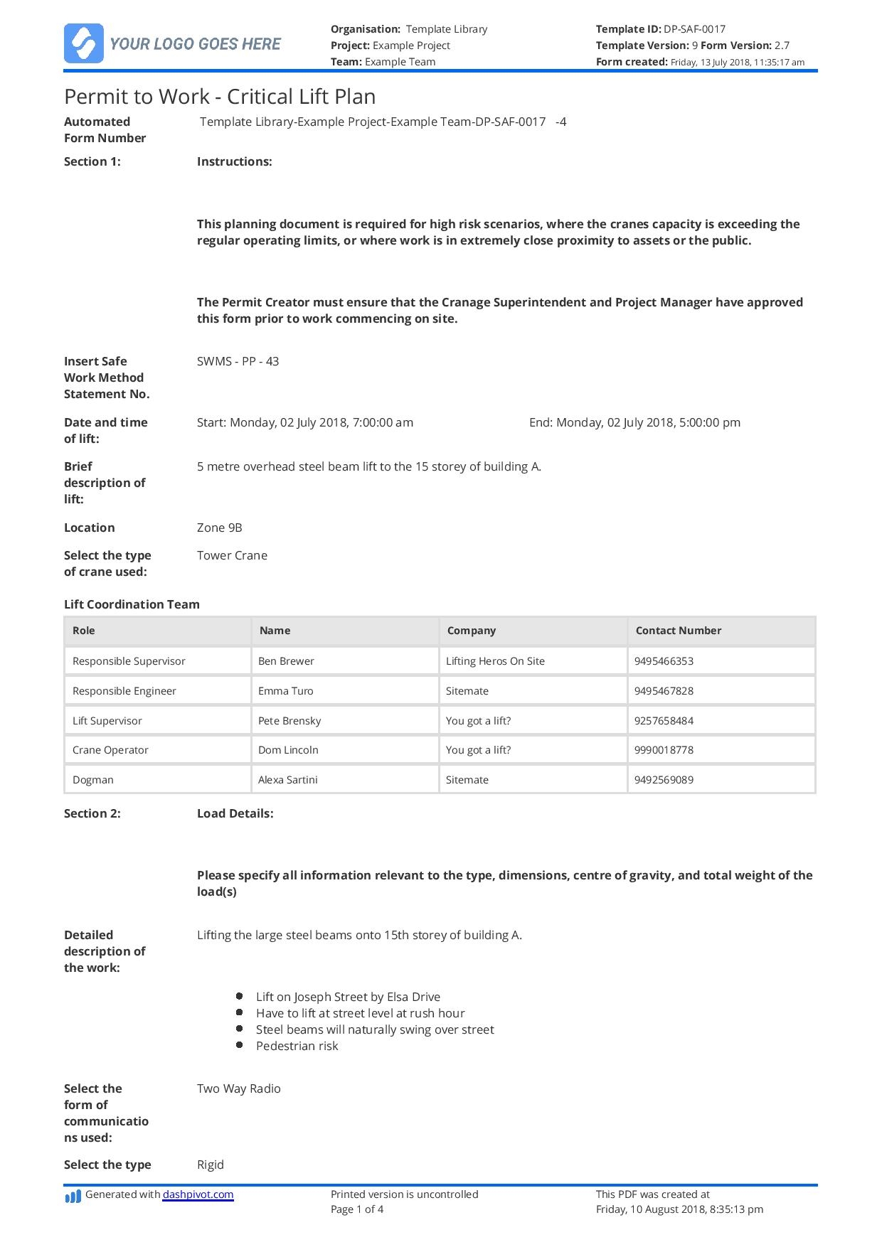 Critical Lift Plan Template Free And Customisable