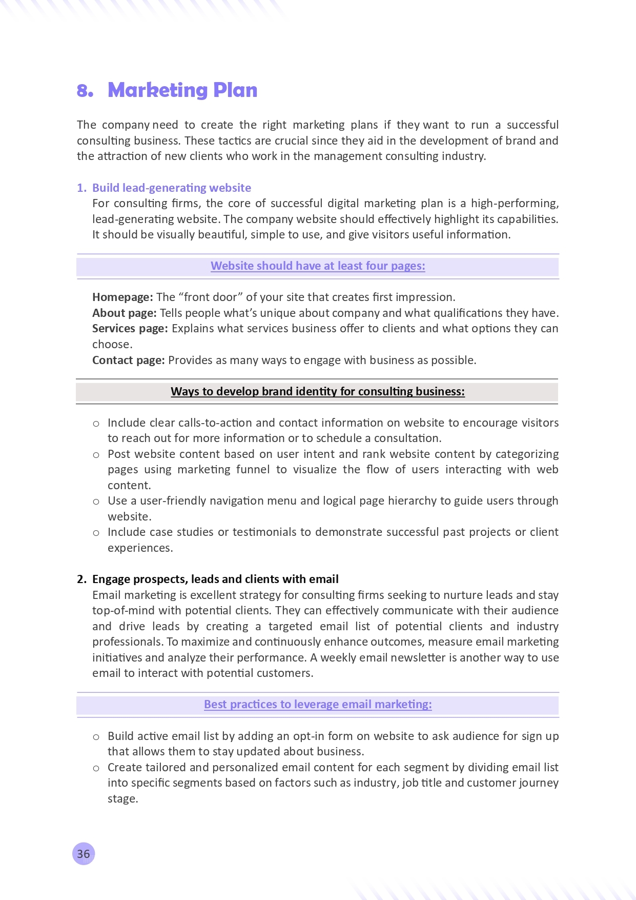 Don’t forget to include financial projections in your business plan. Outline your startup costs, operating expenses, and revenue forecasts to give potential investors or lenders a clear picture of your consulting business’s financial health and growth potential.