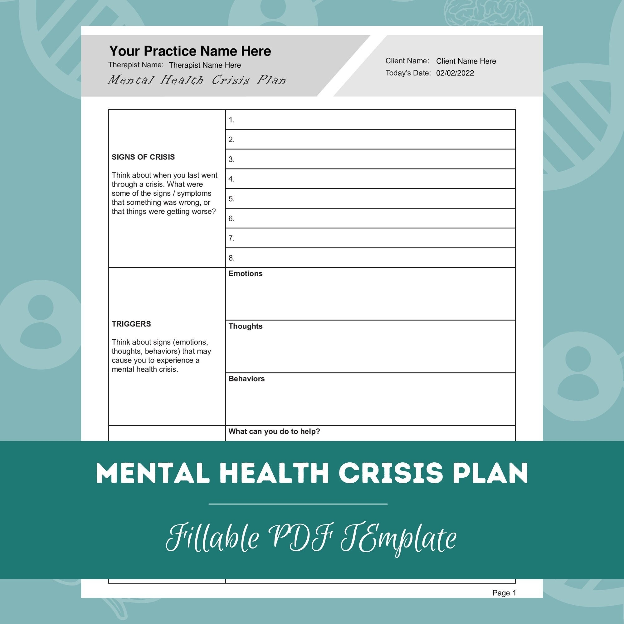 Mental Health Crisis Plan Editable Fillable PDF For Counselors Psychologists Psychiatrists Therapists