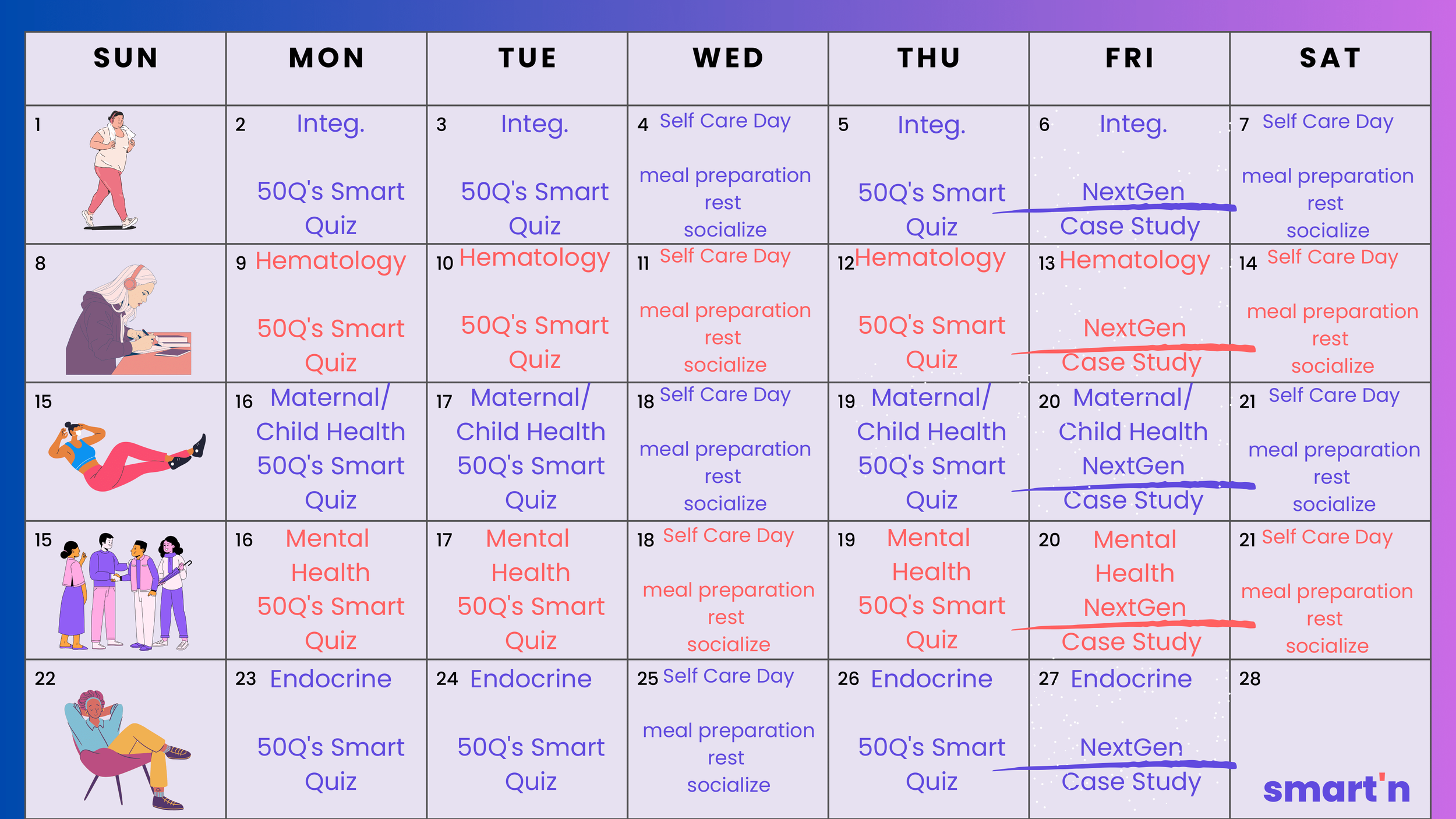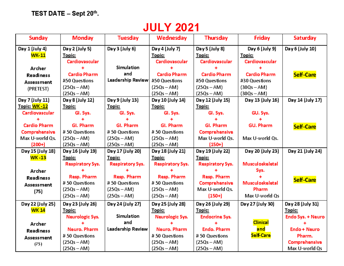 Nclex Study PLAN Sample Calendar For Studying TEST DATE Sept 20th JULY 2021 Sunday Monday Studocu