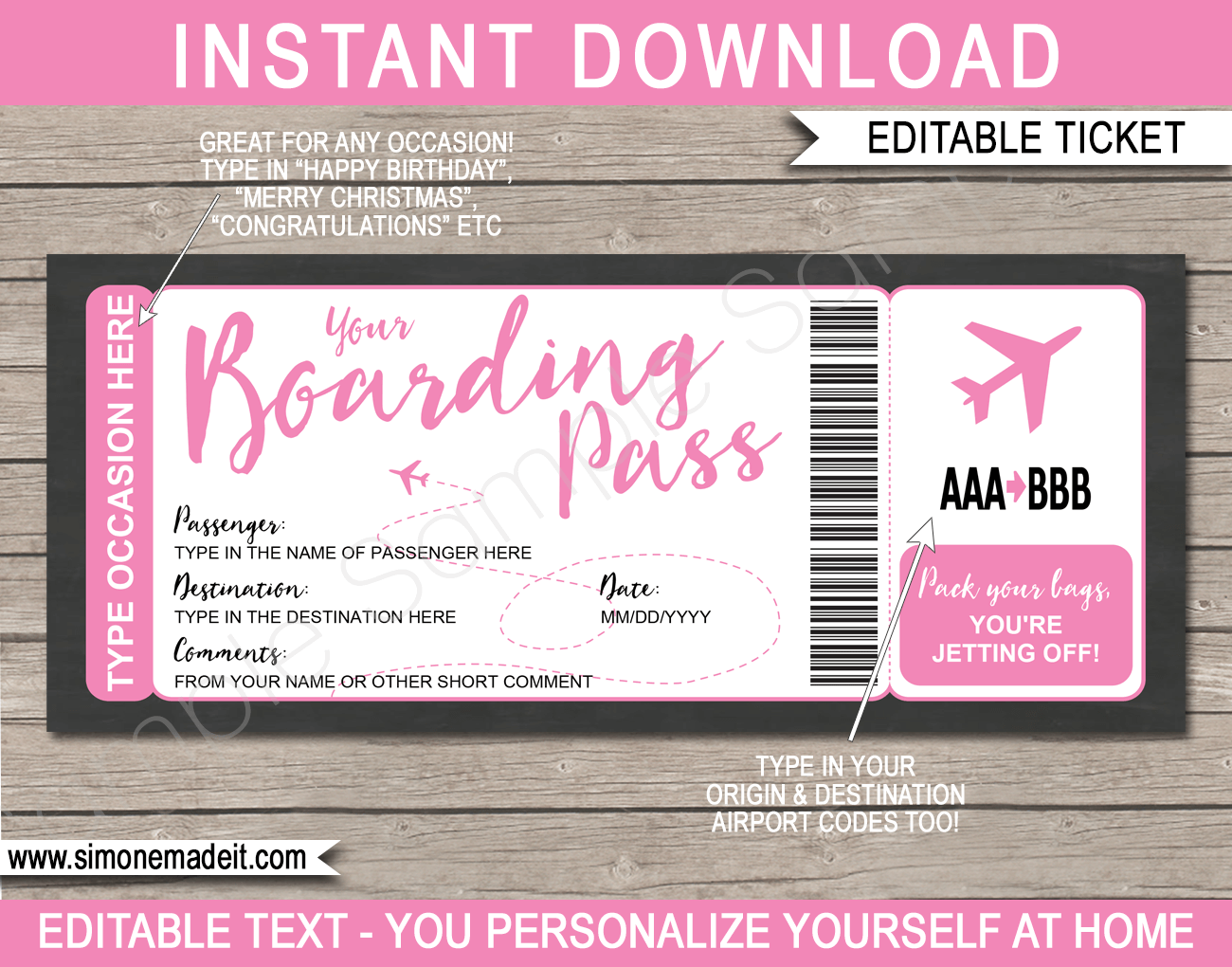 Printable Surprise Trip Ticket Boarding Pass Editable Template
