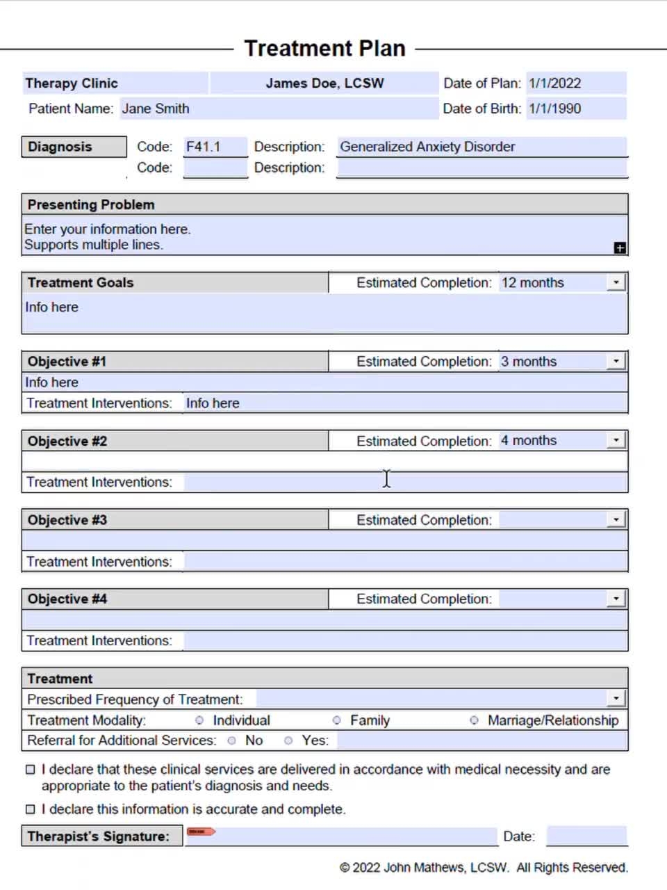 Therapist Sample Treatment Plan Fillable PDF Template Goodnotes Adobe Printable