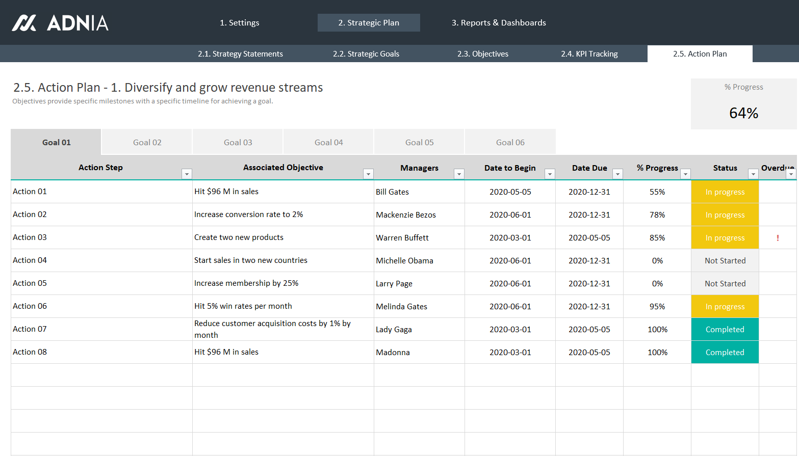 Our template includes sections for key performance indicators, action items, timelines, responsible parties, and progress updates. By regularly updating this template, you can see at a glance how your strategic plan is progressing and make any necessary adjustments.